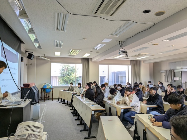 2026年1月13日は、2025年度「入門演習」の最終講義でした。この日は学年全体が集まり、後期授業で各自テーマを決めて調べた内容について、クラス代表によるプレゼンテーション大会が行われました。これは昨年度から始まったもので、今年も一年生全員と担当教員、関心を持って集まってくれた職員が観覧する中で全9組が発表しました。